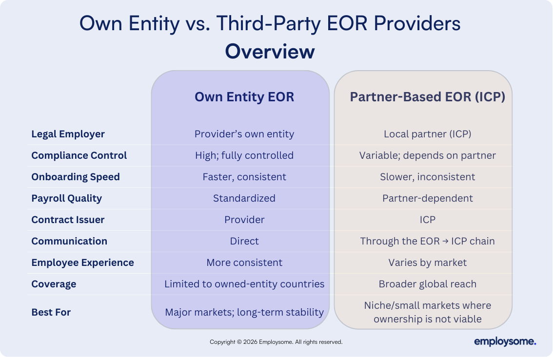 With a third-party EOR, the employer often interacts through an indirect chain: you โ†’ EOR โ†’ ICP. Communication can be slower, and processes differ market by market. If you hire in multiple countries, you may end up dealing with several different ICPs in the background; some excellent, some less reliable which creates variability in service and compliance risk.