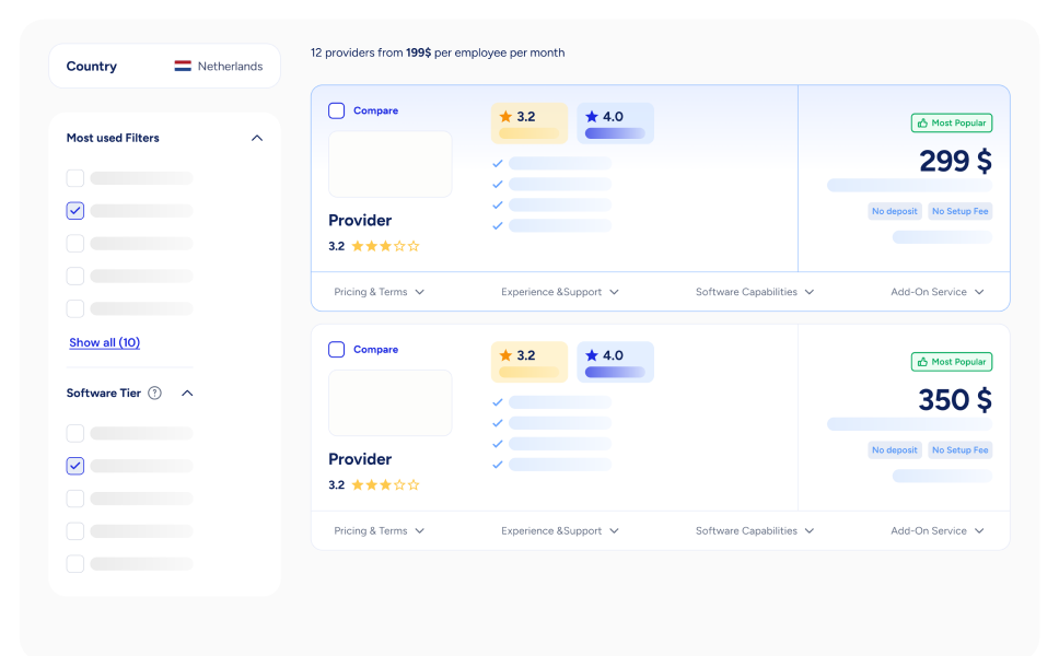Filter providers by Poland coverage, pricing and supported services using the Employsome Comparison Tool. Over 130 providers compared.